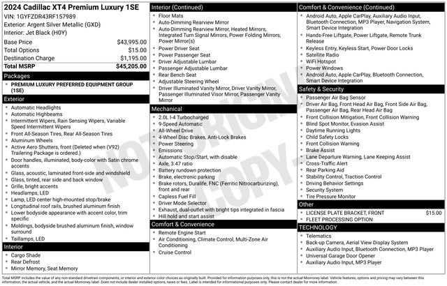Alluring in its design and exceptional in its capabilities, the 2024 Cadillac XT4 Premium Luxury is a true standout in its class. With its impressive array of features and uncompromising performance, this crossover SUV is the perfect choice for the discerning driver seeking a luxurious and versatile vehicle.